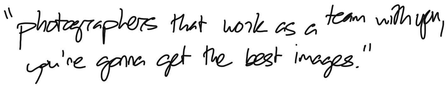 Communication, communication, communication: Look at how often themes like collaboration and working together come up. Pretty clear, right? It’s a good reminder to people that photograph other people that it’s inherently a really human thing. A big, big part of becoming good at this craft is how well you work with others.